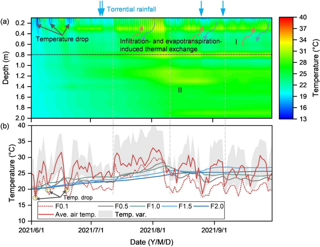 温度监测结果表明,土壤温度在0.8米深度处有明显的分界线,该深度以上的土壤温度对气象条件的响应更加敏感,而深层土壤温度则变化平缓。土壤温度的变化与土壤湿度的变化密切相关,揭示了温度对滑坡稳定性潜在的影响。