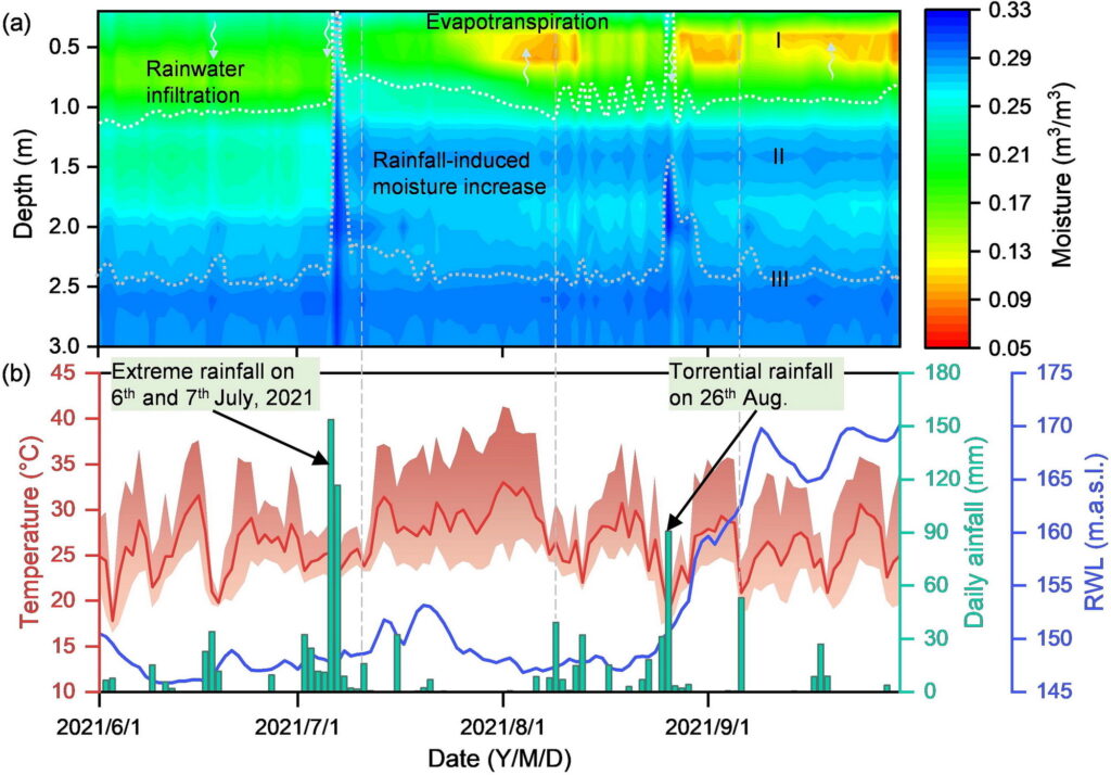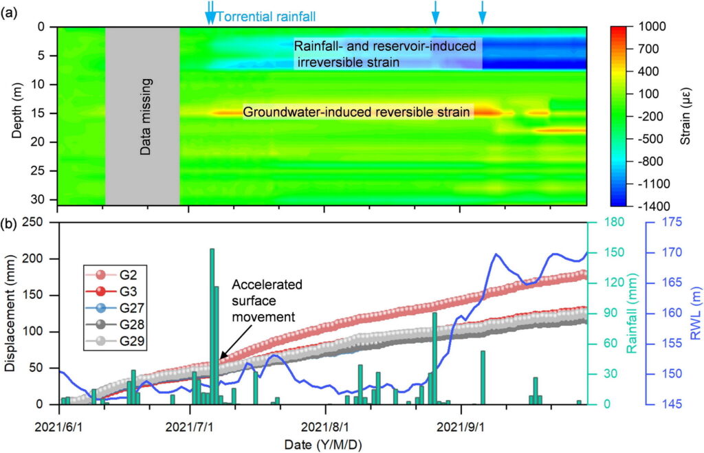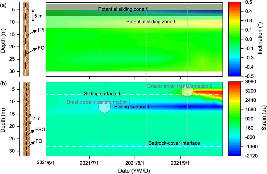 在变形监测中,使用了光纤布拉格光栅(FBG)和微机电系统(MEMS)传感器记录滑坡体内的应变和倾斜变化。监测揭示了两个显著的应变峰值区域,分别位于7米和12米深度,确定了滑动面的具体位置。深层滑动面(约28米深处)在整个汛期内仅表现出轻微变形。在2021年7月6日的大雨后,滑坡体的应变数据出现了明显的压缩应变,表明降雨引发的地下变形具有滞后效应。这一现象说明了滑坡的水文和力学过程对表层水分平衡的短期变化不敏感,并且对降雨事件的响应可能会滞后数天甚至数月。