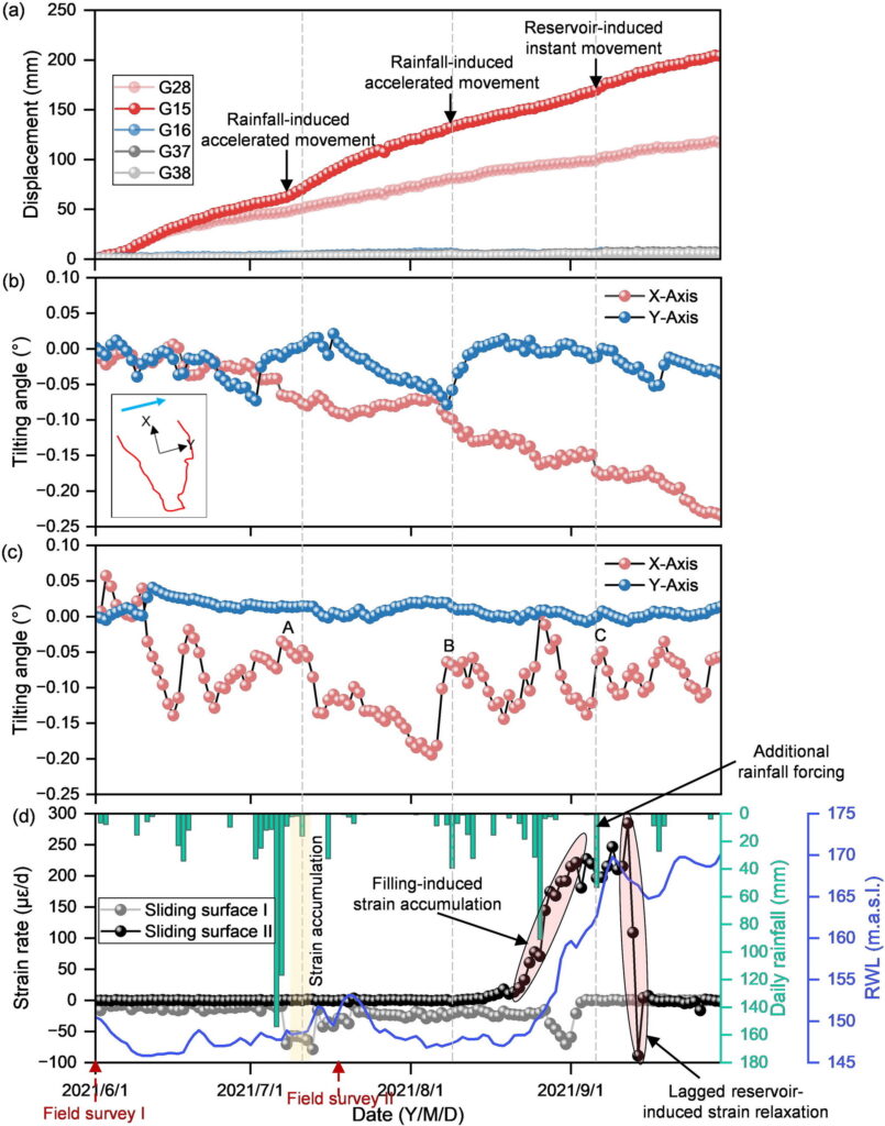 监测还包括对滑坡表面和地下的动态行为分析。通过GNSS标记和MEMS倾斜传感器的数据,显示出地表位移与地下应变的相互关系。分析表明,滑坡下部区域的变形主要由雨水渗透引起,而上部区域则受水库水位波动的影响。尤其是防滑桩前的土壤发生了显著的变形,而防滑桩后的区域则相对稳定。此外,文章通过对滑动面的应变速率、表面位移和倾斜角度的时间序列分析,发现了多个关键的变形加速点。这些加速点主要与极端降雨和水库水位的剧烈变化相关。