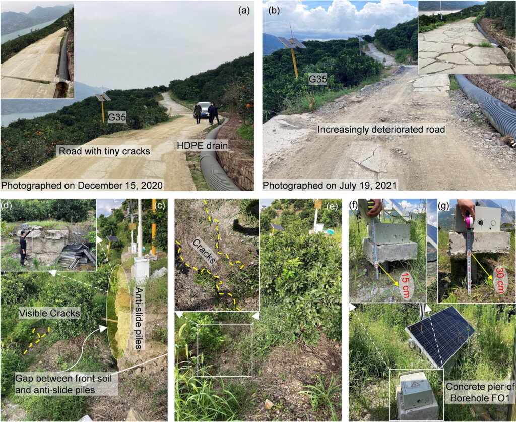作者通过现场调查验证了监测结果,发现大量道路裂缝和地面沉降现象,尤其是在防滑桩前的区域。这些现场证据与监测数据高度一致,进一步验证了滑坡体的加速变形过程。