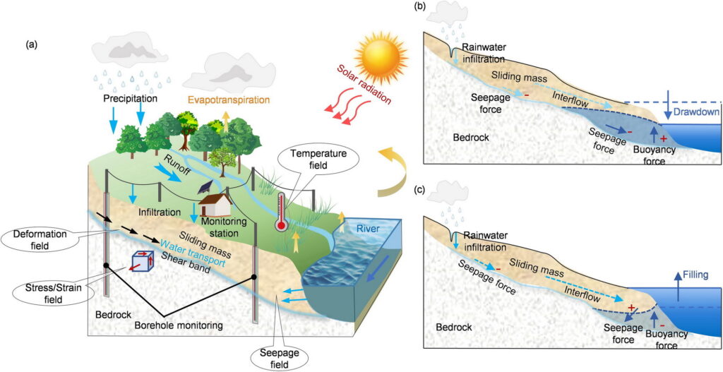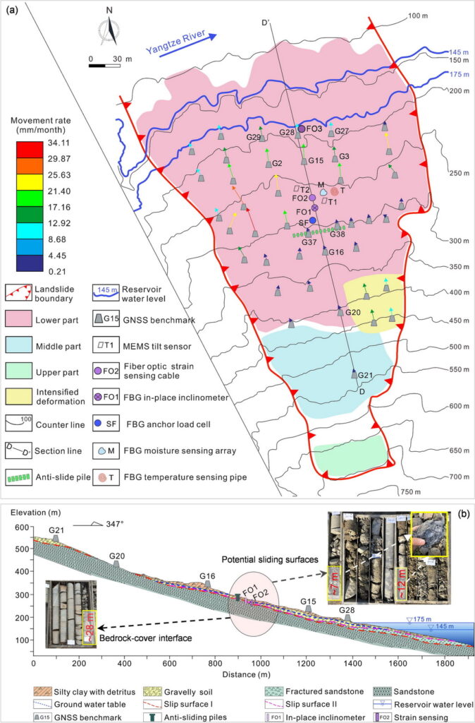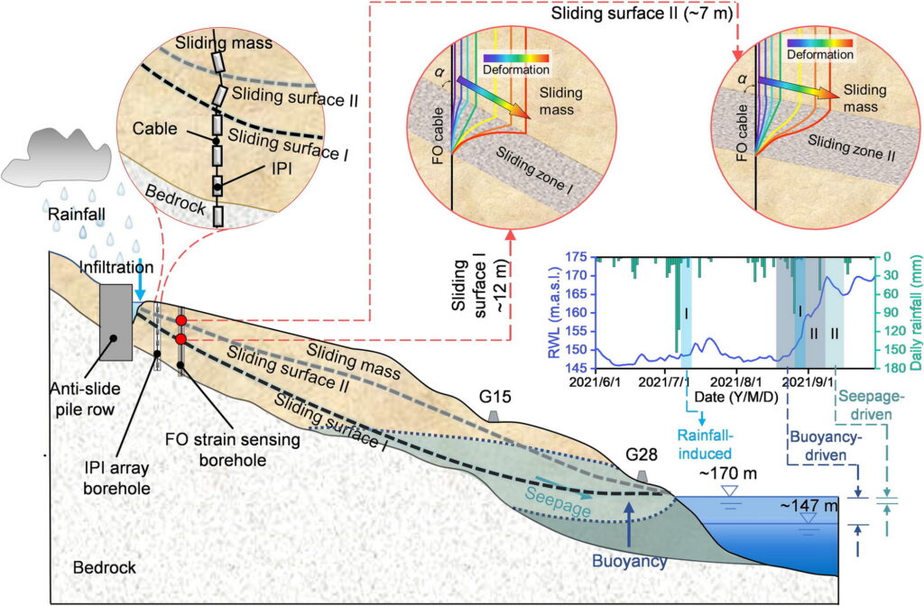 文章介绍了一种经济高效的双源综合监测系统,用于实时监测滑坡的多物理过程,以更好地理解滑坡的变形机制。研究发现,深层滑动面主要受到极端降雨的影响,而浅层滑动面则受到水库水位变化和降雨的共同驱动。该研究为滑坡防治和工程措施的改进提供了新的思路和依据。