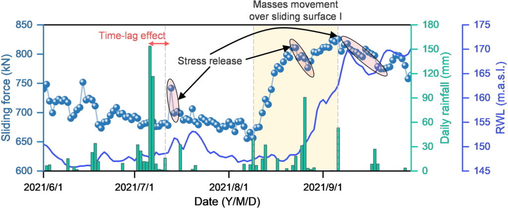 滑动阻力的监测采用了锚固电缆,通过轴向应力的变化来指示滑动体在水平位移过程中滑动阻力的变化。监测显示,在降雨高峰期后,滑动阻力显著增加,随后由于变形导致的应力释放,滑动阻力迅速下降。特别是持续的降雨事件和水库水位的波动对滑动阻力有显著影响,这些现象表明滑坡的运动具有滞后效应,即降雨后的地下变形并不会立即发生,而是随着时间的推移逐渐显现。