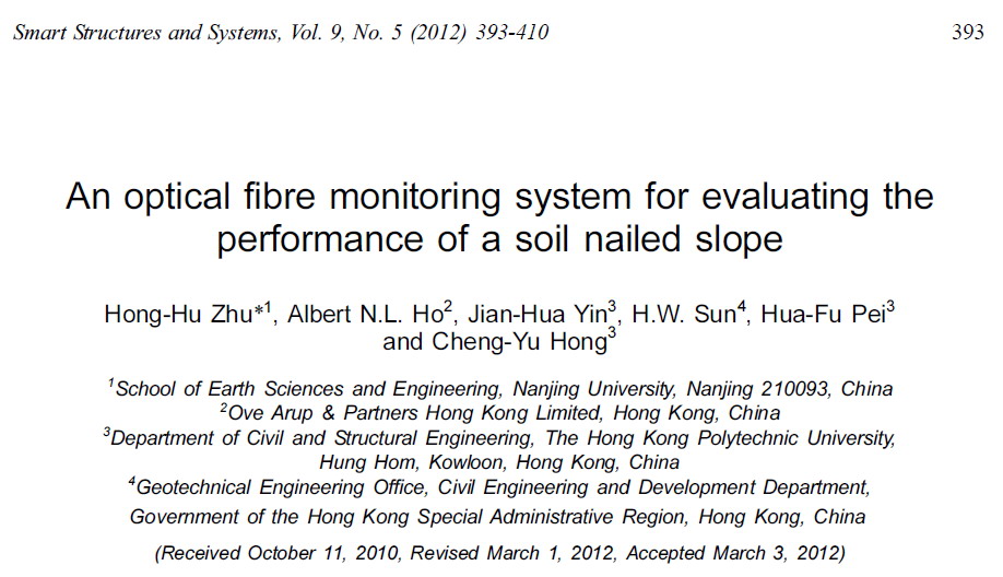 Zhu, H.-H., Ho, A. N. L., Yin, J.-H., Sun, H. W., Pei, H.-F., & Hong, C.-Y. (2012). An optical fibre monitoring system for evaluating the performance of a soil nailed slope. Smart Structures and Systems, 9(5), 393-410. https://doi.org/10.12989/sss.2012.9.5.393
