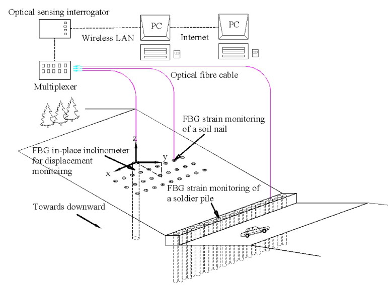 团队联合香港理工大学、香港特区政府土木工程拓展署及奥雅纳工程顾问公司,在香港鹿径道公路高边坡(边坡编号:3NE-C/C135)成功部署光纤综合监测系统,沿14 m长的土钉、16 m长的抗滑桩及15 m深的钻孔内布设光缆,对该边坡开展连续监测,为该地的边坡加固工程提供了实测数据和技术验证。该系统的传感元件由准分布式FBG应变传感器、温度传感器及自研的固定式测斜仪构成,单根光纤串联>100测点,分辨率1 pm,总传感链路约4.3 km。他们创新提出了“管式封装+环氧护套+铠装环回”的布设工艺,现场传感器存活率大于95%,彻底解决了裸纤脆弱易断的技术难题。