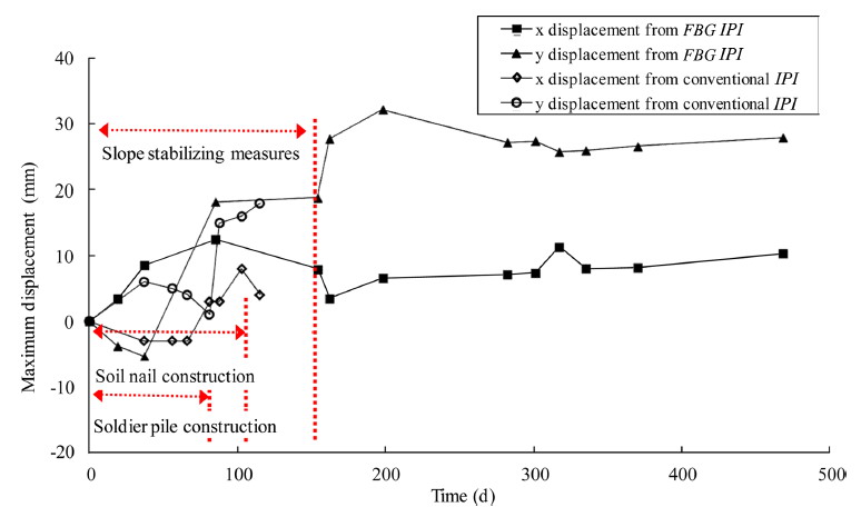 在现场布设前,所有传感器均经实验室标定,应变精度0.83 με,温度精度0.10 ℃,位移计算结果与传统测斜仪差异<0.5 mm。2008至今累计采集了1.8万组数据。数据显示,土钉在雨季最大应变超800 με,对应轴向拉力由40 kN升至54 kN,雨后应变逐渐回落。抗滑桩桩头应变随降雨波动,深层测点变化微小,表明支护体系具备剩余安全储备。