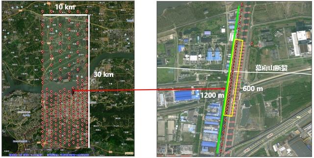 台阵纵横交织,布下一张监测密网。郑江蓉介绍,台阵由面状观测台阵和线状测线两部分组成,其中,面状观测台阵分布在长江以南以1公里点/线间距分布,在长江以北以2公里点/线间距分布。同时,跨焦山-幕府山断裂布设了一条800米的线状测线,点间距为30米,并进行震源车主动源P波、S波震源激发。